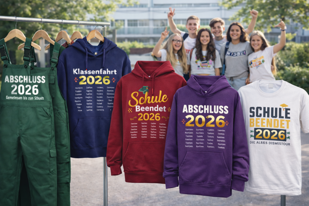 Wir bedrucken Abschlussshirts, Hoodies, Pullis oder Latzhosen für Abi-Jahrgänge, Abschlussklassen und Schulausflüge – individuell gestaltet, hochwertig umgesetzt und bereits ab 1 Stück.